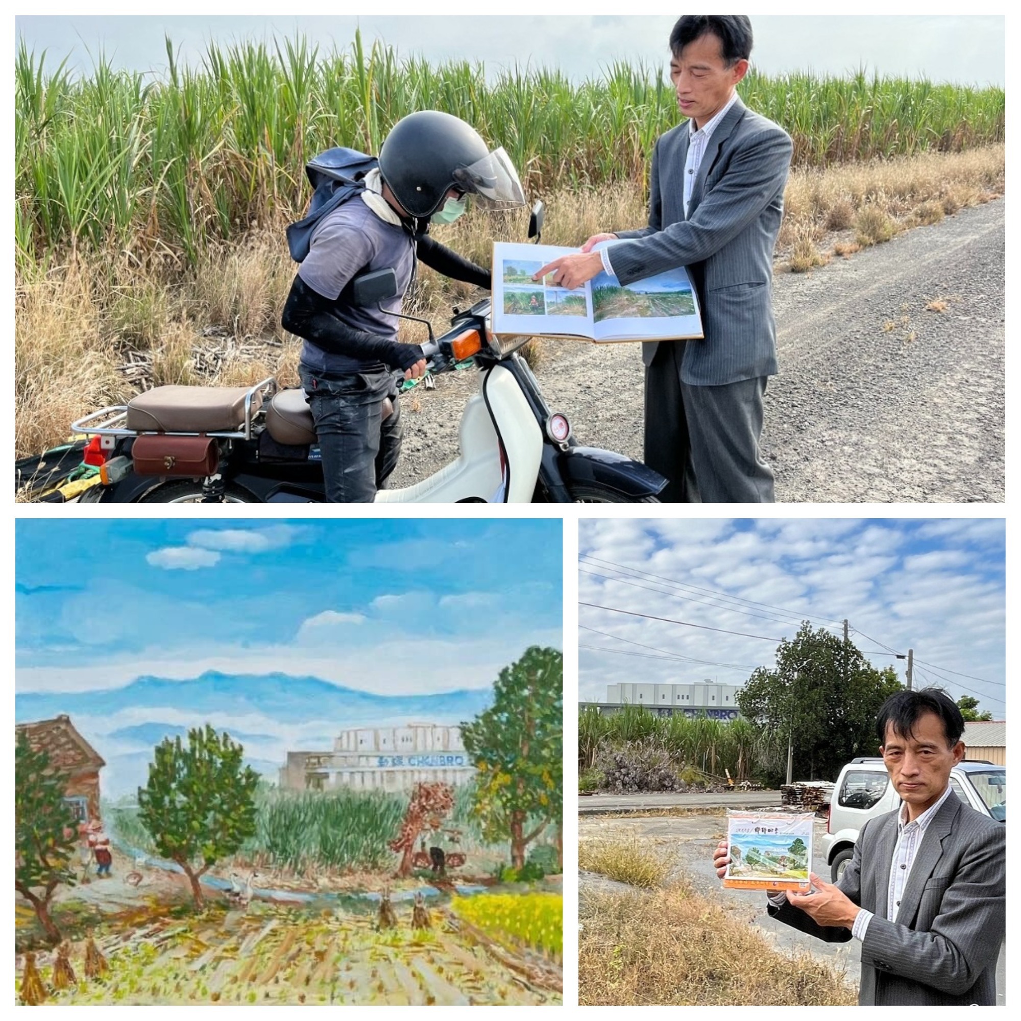 見到孩子們來校外教學,他很自然地湊上前問是哪間學校的﹑學校在哪裡,聽到孩子們的咯咯嬉鬧,直說讓人開心有活力;後來,我們在甘蔗田遇到新來的管理員騎車過來查問,他便說:「你不認識我,那你一定是新來的,來,給你看這張,就是我以前在這邊畫圖,你們主任也有騎車過來,他還說老師你要畫要趕快喔,這邊將來是科學園區…」